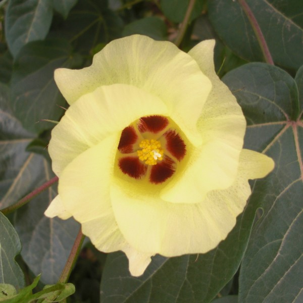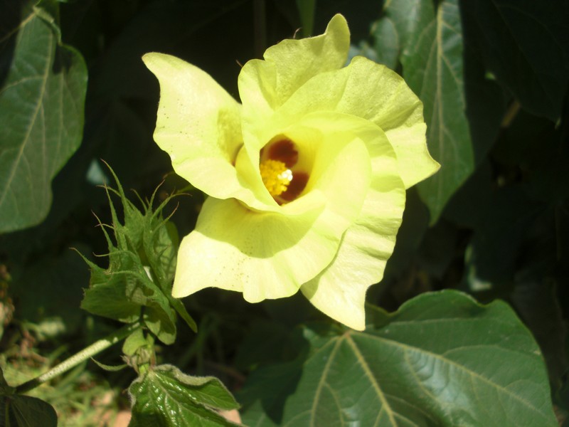 Plant et fleur de cotonAu 2010, une petite graine de coton. Aujourd’hui le plant fait 2 mètres, très touffu. De belles jaunes naissent et meurent dans la journée. Une découverte, pour nous occidentaux mais une réalité ancienne au Maroc. Mon oncle travaillait sous ces cieux dans les années 50 et s’occupait de la production dans la région de Beni mellal.